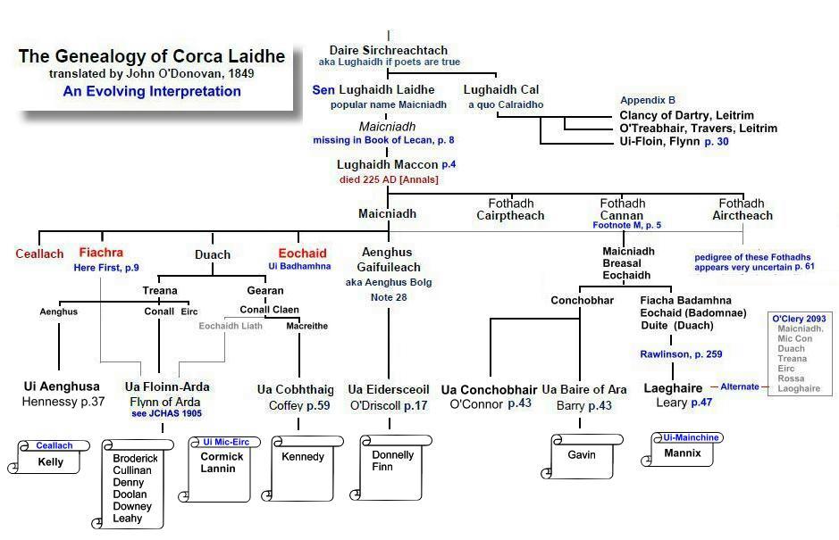 There is documentation of the names of the hereditary proprietors (chieftains) of Corca Laidhe, relatives, and their subjects from the 12th century. Corca Laidhe Pedigree (below) describes some of the texts used to reconstruct the family histories.