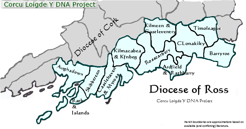 The Corca Laidhe people ended up somewhat confined to the boundaries of the old Catholic Diocese of Ross, comprised of parts of the present day districts of Skull, Skibbereen, and Clonakilty in West Cork. The illustration shows the portion of the diocese along the Skibbereen to Clonakilty coastline. Relevant R.C. Parishes include Aughadown, Rath & Islands, Skibbereen, Castlehaven & Myross, Kilmacabea & Kilfaughnabeg, Rosscarbery & Lissavaird, Kilmeen & Castleventry, Clonakilty & Darrara, Ardfield & Rathbarry, Timoleague & Clogagh, and Barryroe (Lislee, Abbeymahon, Donoughmore).